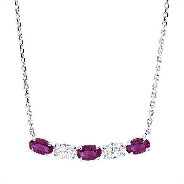 Collier 18 kt WG, mit ZÖ 42 cm, 2 Oval 0,40 ct, TW-si, 3 Rubine 0,86 ct rot, H:5,3 mm, B:24,3 mm, L:45,0 cm, S:3,2 mm