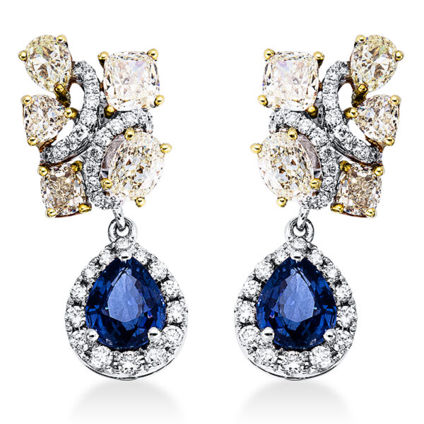 Ohrschmuck 18 kt WG+GG, 68 Brillanten 1,06 ct, TW-si, 10 Fant-Schl. 1,96 ct, gelb, 2 Saphire 1,76 ct blau, H:23,1 mm, B:9,2 mm