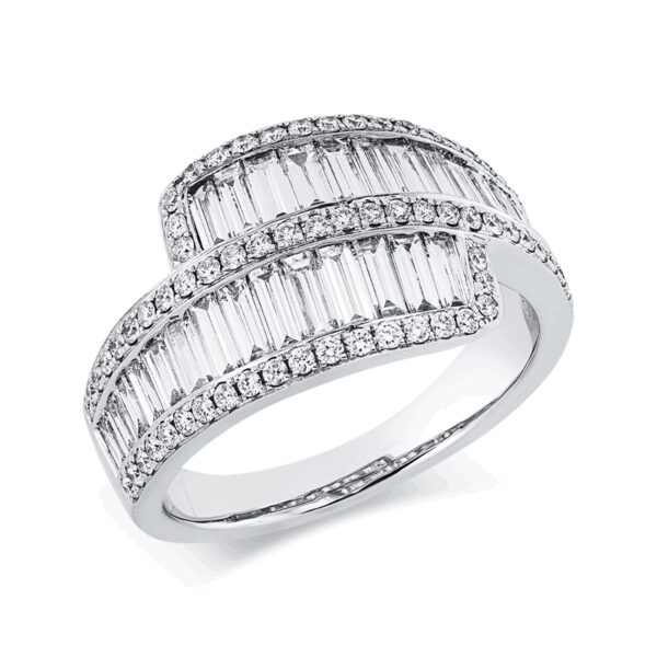 Ring 18 kt WG, 28 Baguette 1,23 ct, TW-vsi, 68 Brillanten 0,34 ct, TW-si, Weite:53